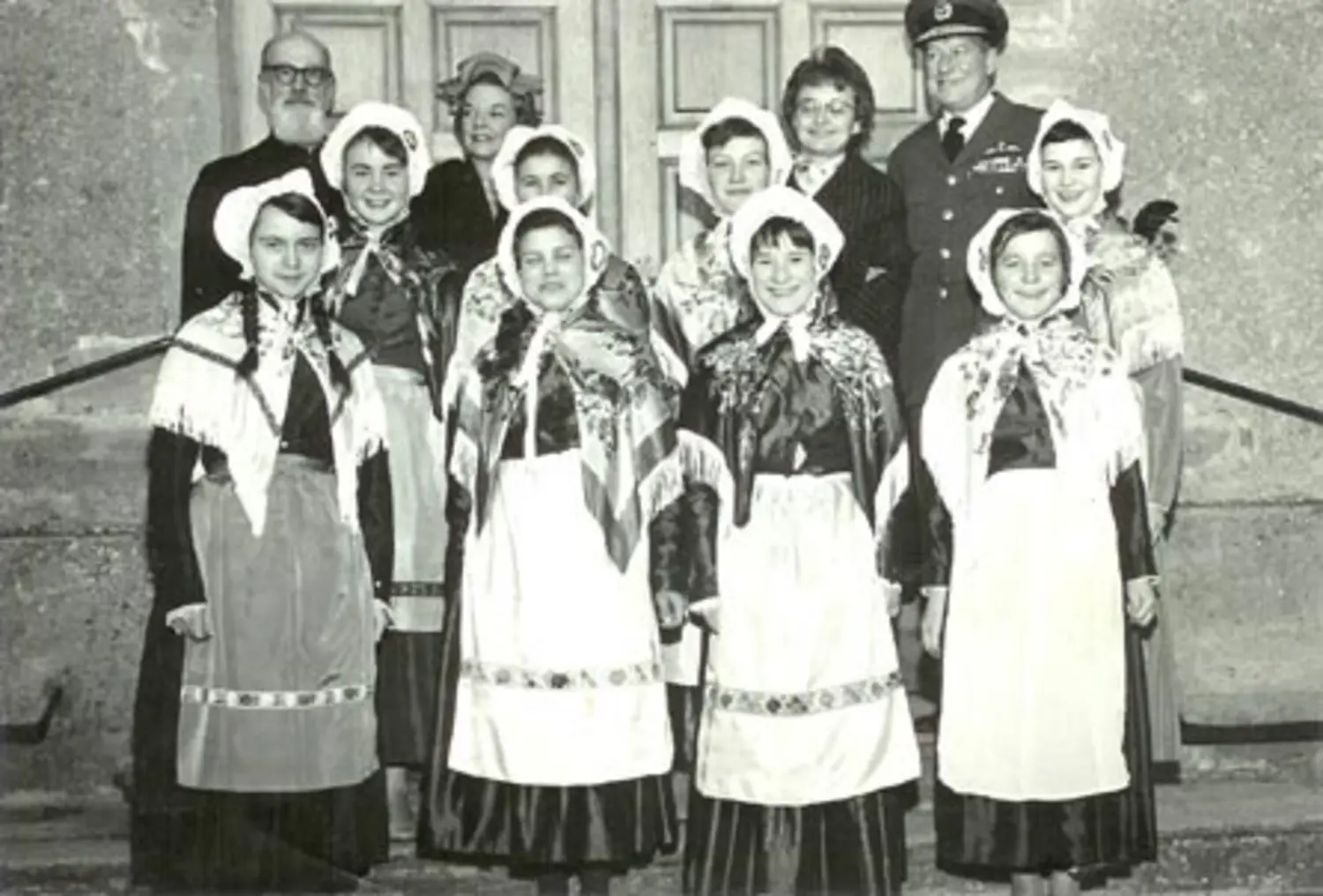 Photo ancienne : L’armée canadienne s’est investie dans la vie du village. Cliché effectué devant l’église représentant le père ZEITER curé de l’époque, le chef de corps de la 1er Division Aérienne Canadienne avec des jeunes filles du village.