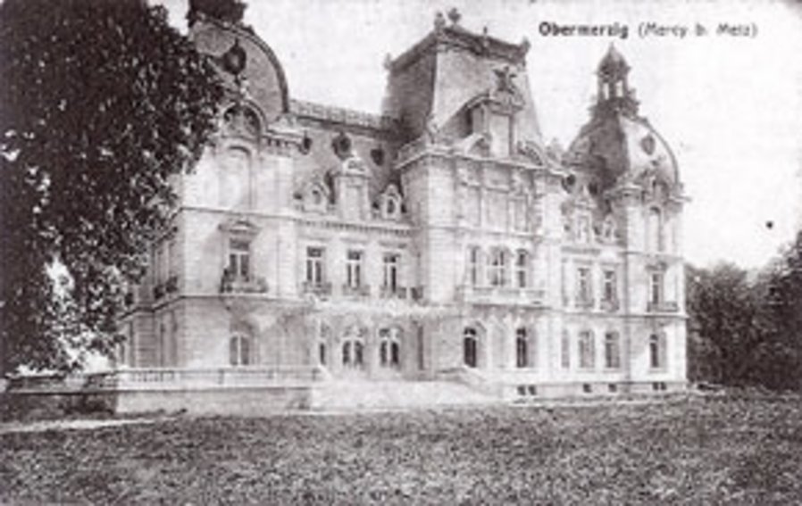 En 191O, GUILLAUME II voulant améliorer les défenses de METZ fait construire sept nouveaux ouvrages. L un deux se trouve à proximité du château de MERCY. A la même époque, le château est rattaché à la commune d’ARS-LAQUENEXY et relié par des routes à ARS et à JURY. Au cours de la Première Guerre mondiale (1914 1918), le château qui a été mis sous séquestre, abrite des compagnies du Génie du fort et des services administratifs allemands. La région de MERCY étant soumise à la réglementation particulière de la zone fortifiée de METZ, il faut un passeport spécial pour y pénétrer. En 1915, les noms des lieux sont germanisés. ARS-lAQUENEXY devient ARSTEIL KENNCHEN et MERCY devient OBERMERZIG. En 1919, le domaine est vendu. Un Suisse, SHNEIDER, achète le château. SCHNEIDER crée un élevage de bovins. Pour ce faire, il détruit le magnifique jardin à la française, afin d’installer des clôtures de parcage. Endetté, il disparait de la région et MERCY est racheté par les Domaines* en 1938.