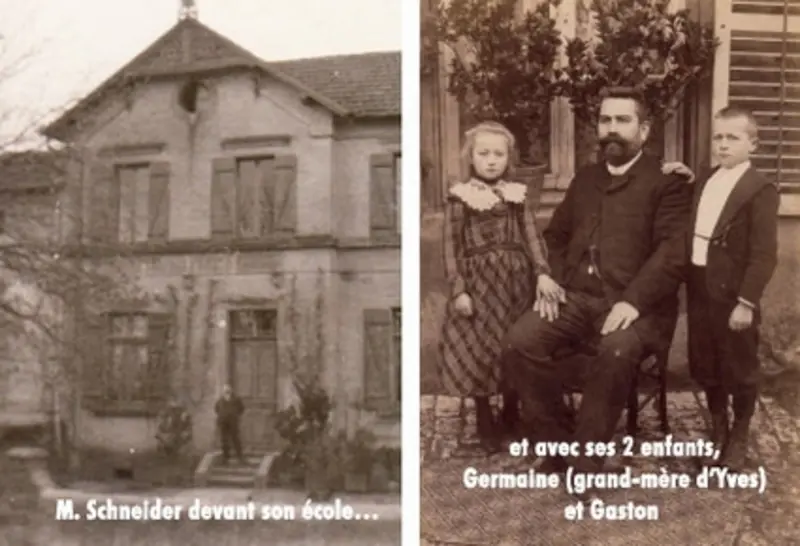 En 1914, M. Schneider fut l’instituteur de mon père alors qu’il avait 6 ans et il en gardait tellement de souvenirs (bons ou mauvais) qu’il aimait nous raconter ces années passées avec lui, années qui pour M. Schneider ne furent surement pas faciles car il devait apprendre l’allemand à ses élèves alors que son fils Gaston était tombé à la guerre dès le début de celle-ci.